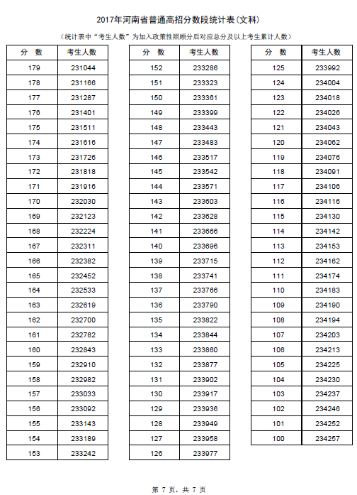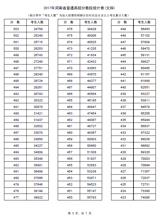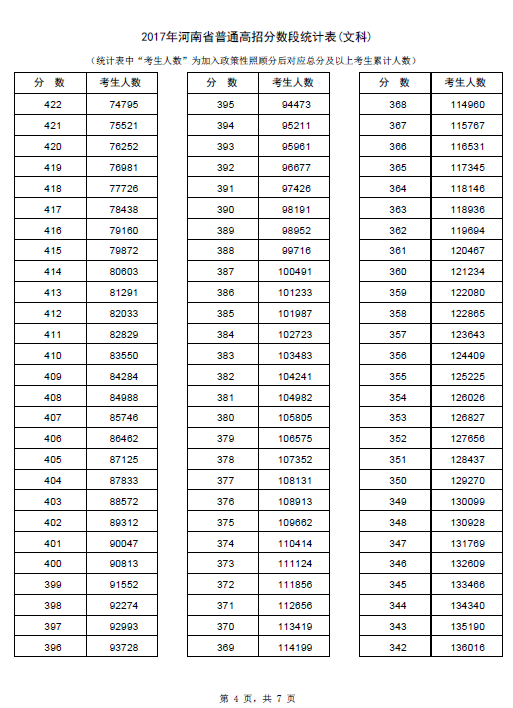 2017年河南省普通高考文科類分數(shù)段統(tǒng)計表詳細如下: