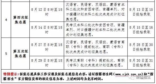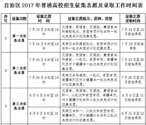 新疆2017年普通高校招生錄取工作于7月5日開始,預計8月底結(jié)束,各批次錄取工作時間、征集志愿及錄取工作時間安排如下: