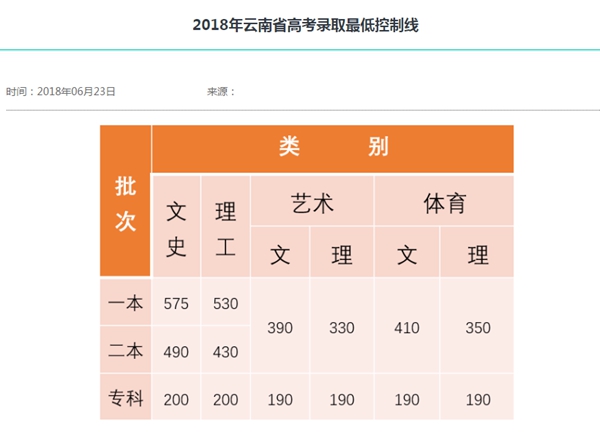 云南2018招生錄取一本線(xiàn)文科575分 理科530分