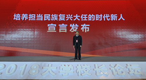 人民網太原10月25日電 今日,主題為“回歸·創(chuàng)新·育人”的人民網2018大學校長論壇在山西太原舉行。圖為太原理工大學黨委書記吳玉程發(fā)布“培養(yǎng)擔當民族復興大任的時代新人”宣言。