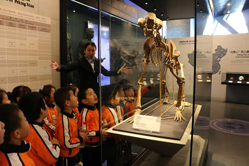 大班幼兒則由講解員阿姨帶領到博物館里進行參觀。在講解員阿姨的介紹下,孩子們知道了我們的祖先大多是群居生活的,他們一起打獵、一起吃東西、一起休息、一起玩樂……在這里孩子們了解了周口店猿人的歷史和進化,學到了知識。