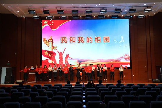 伴隨著音樂(lè)響起,青年教師聯(lián)合會(huì)成員從觀眾席的四面八方登上舞臺(tái),高舉五星紅旗,與臺(tái)下觀眾共同唱響歌曲《我和我的祖國(guó)》,現(xiàn)場(chǎng)氣氛熱烈感人。