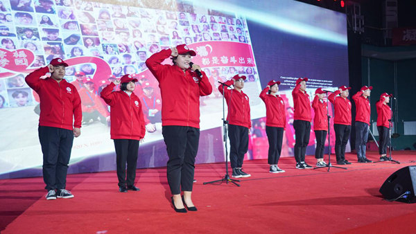 活動現(xiàn)場,由學(xué)校退役士兵組成的標兵方隊,邁著整齊矯健的步伐,手握國旗,高喊“祖國萬歲”的響亮口號,正步入場。古箏、小提琴、大提琴、長笛、小號等樂器獨奏先后悠揚響起,與會領(lǐng)導(dǎo)、師生700余人揮舞國旗,齊唱《我和我的祖國》向新中國70華誕獻禮,F(xiàn)場氛圍熱烈,師生們心潮澎湃,洋溢著青春和熱情的快閃將整場活動推向高潮,表達了師生對祖國的一片深情和美好祝愿以及投身中華民族偉大復(fù)興中國夢的堅定決心。