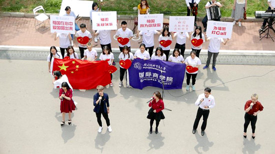 作為此次活動的第一棒,國際商學院于5月10日中午在一食堂門前上演了精彩的快閃傳唱活動,用歌聲直抒胸臆,表達對祖國的熱愛與美好祝愿。