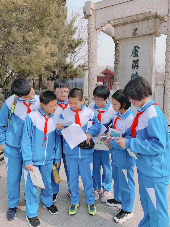 走出抗日戰(zhàn)爭紀念館,同學們又來到盧溝橋上。各班按“盧溝歷史”、“盧溝曉月” 、“橋文化”、“小品建筑”等主題分為小組,一邊看著兩側(cè)欄桿的石獅子,驚嘆于先人的雕工精巧,獨具匠心,一邊又感慨于這些石獅曾經(jīng)經(jīng)歷過當年戰(zhàn)火的洗禮,曾目睹了革命先輩用自己的血肉之軀捍衛(wèi)民族尊嚴。一獅一石,一碑一路,無不令同學們深深意識到今天幸福生活的不易。