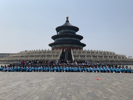初一年級同學(xué)走進天壇,徜徉于圜丘、回音壁、丹陛橋和祈年殿之間,在天壇嚴(yán)謹?shù)慕ㄖ季趾推婷罟妍惖慕ㄖO(shè)計之中,感受中國特有的傳統(tǒng)祭壇文化。