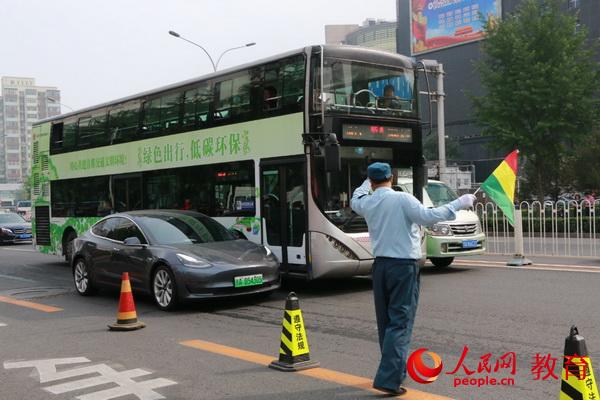 7日上午,安保人員指揮車(chē)輛繞行考點(diǎn) 盧靜/攝