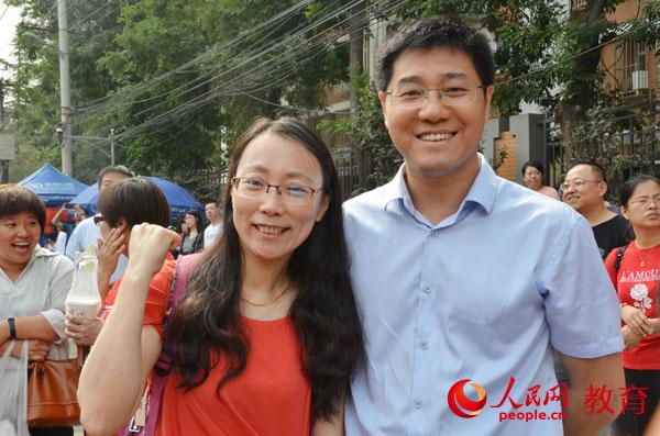 北京市三里屯第一中學(xué)的蘇老師(右)為考生加油 曹雯/攝