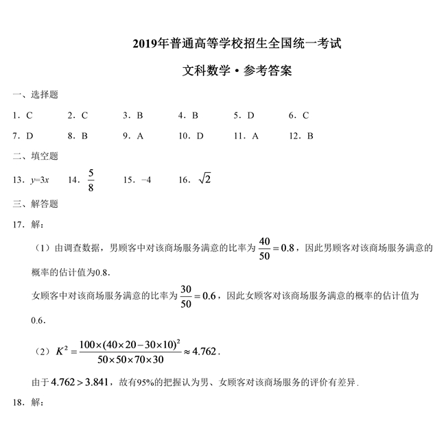 2019年全國(guó)卷Ⅰ文科數(shù)學(xué)高考試題答案