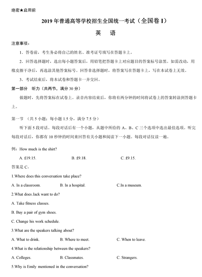 2019年全國卷Ⅰ英語試題