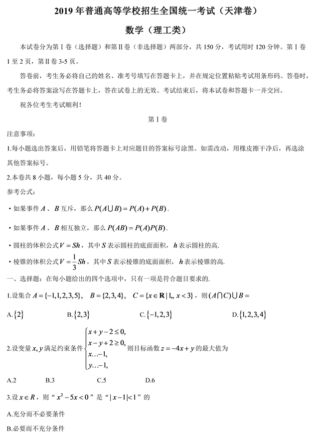 2019年天津卷理數(shù)高考試題