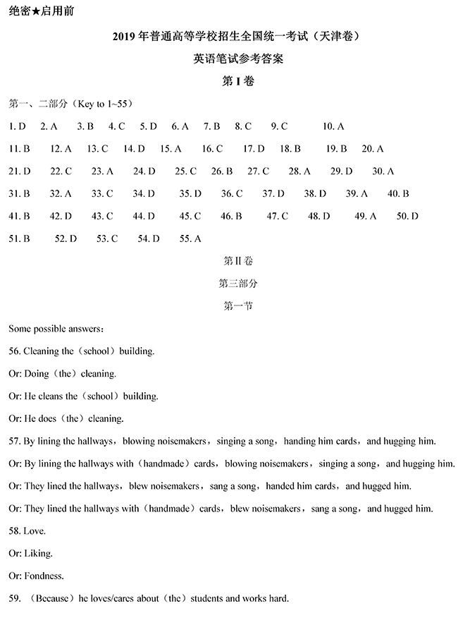 2019年天津卷高考英語試題答案
