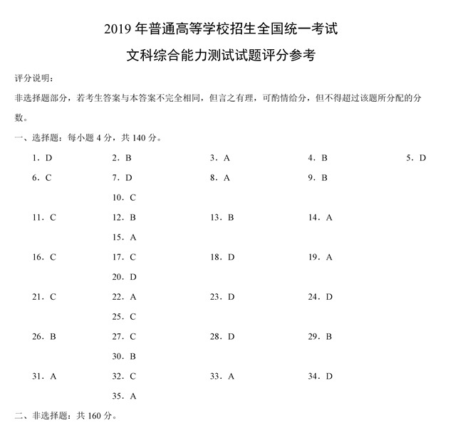2019年全國(guó)卷Ⅱ文綜高考試題答案