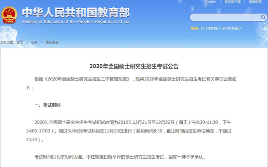 人民網(wǎng)北京8月19日電 (記者 郝孟佳 實(shí)習(xí)生 黃鈺霖)今天,教育部網(wǎng)站發(fā)布了《2020年全國(guó)碩士研究生招生考試公告》。公告確定,2020年全國(guó)碩士研究生招生考試網(wǎng)上報(bào)名時(shí)間為2019年10月10日至10月31日(每天9:00-22:00)。初試時(shí)間為2019年12月21日至12月22日(每天上午8:30-11:30,下午14:00-17:00)。