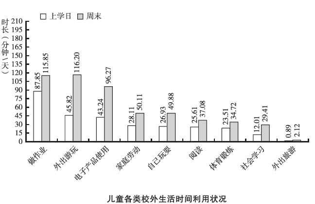 報告顯示,在上學(xué)日,平均每個兒童的校外生活時間分配中,花費時間最多的類別是做作業(yè)(包括學(xué)校作業(yè)、課外班作業(yè)、家長布置的作業(yè)、其它作業(yè)),占時87.85分鐘。在周末,占據(jù)兒童校外生活時間最多的事項是外出游玩,占時116.20分鐘。在假期,78.70%的兒童有暑假走親訪友的經(jīng)歷,62%的兒童有外出旅游的經(jīng)歷。