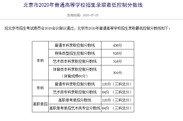 人民網(wǎng)北京7月25日電 據(jù)北京教育考試院消息,北京市2020年普通高等學校招生錄取最低控制分數(shù)線發(fā)布,普通本科錄取線為436分。