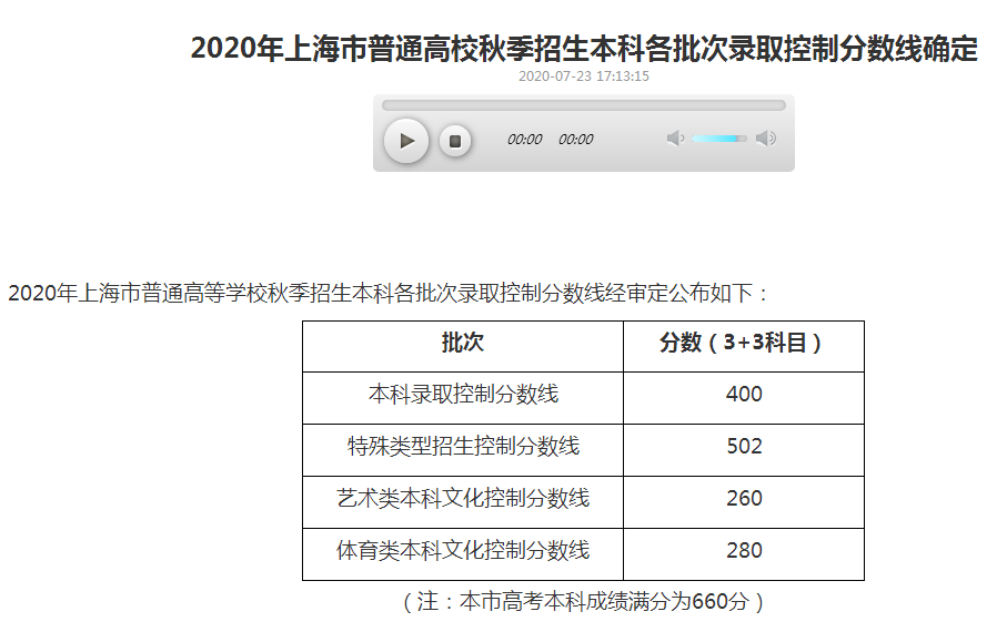 2020上海高考分?jǐn)?shù)線發(fā)布:本科錄取控制分?jǐn)?shù)線400分