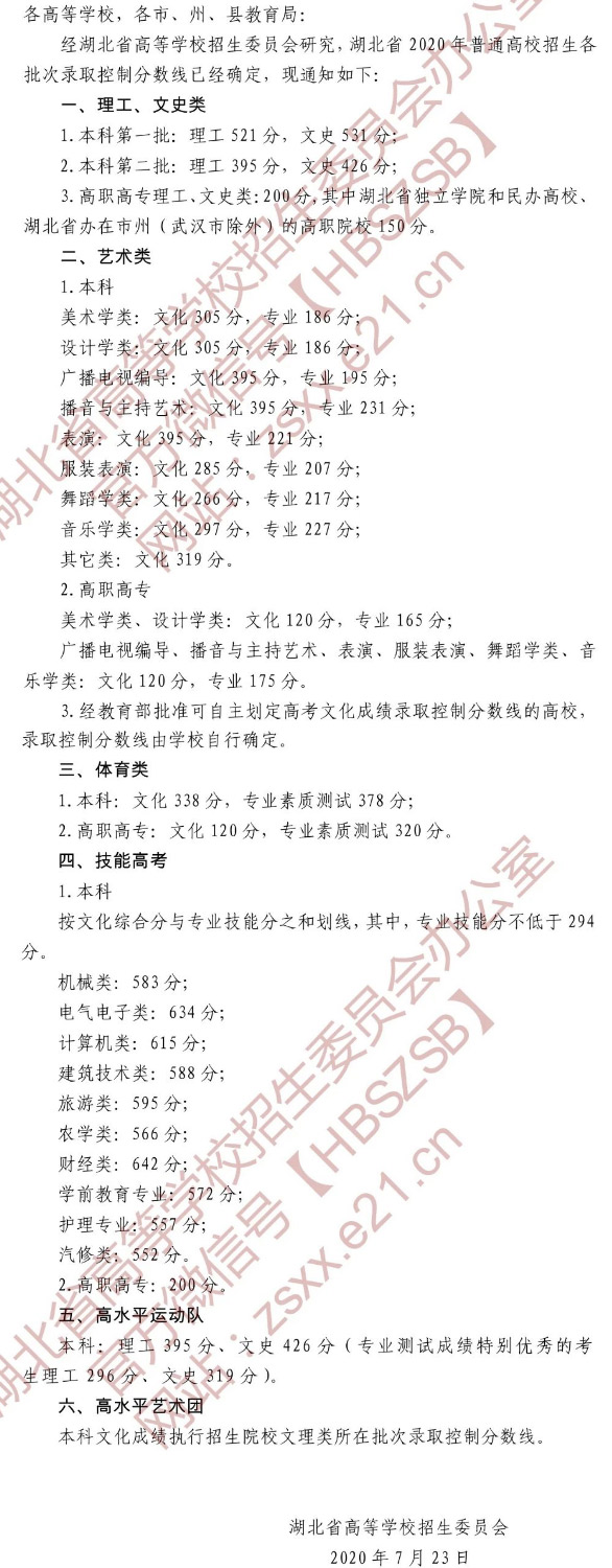 人民網(wǎng)北京7月27日電 據(jù)湖北教育考試網(wǎng)消息,2020年普通高校招生錄取控制分數(shù)線劃定,文史一本531分 理史一本521分。