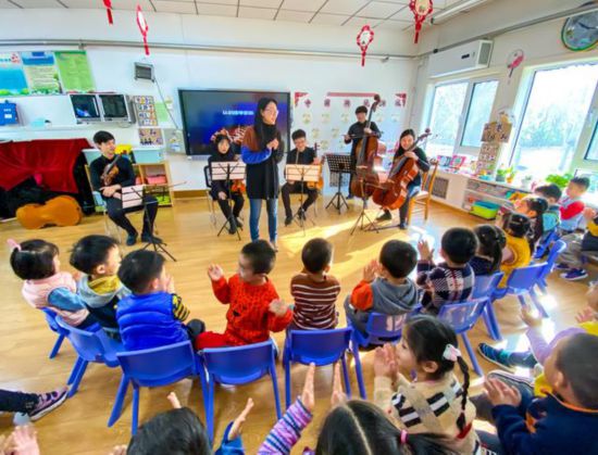 圖片說明:11月25日,山東大學(xué)藝術(shù)學(xué)院大提琴教師王碩及其學(xué)生正在為幼兒園的小朋友們上大提琴與室內(nèi)樂欣賞課。