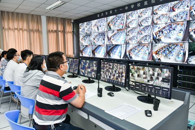 重慶十一中考點監(jiān)控室,考務(wù)人員對考場進(jìn)行實時監(jiān)控。鄒樂攝