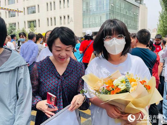 第一場考試結(jié)束,陪考家長在考點外焦急等候,為考生送上鮮花。人民網(wǎng) 張聿修攝
