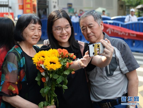6月9日,在湖南省長沙市一中考點(diǎn),考生在考試結(jié)束后與家人合影。