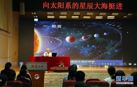 當(dāng)日,中國科學(xué)院院士、中國月球探測工程首任首席科學(xué)家歐陽自遠(yuǎn)走進(jìn)北京二中教育集團(tuán)為師生做了“向太陽系的星辰大海挺進(jìn)”主題演講,并觀摩了學(xué)生的科技作品。新華社發(fā)(周良 攝)