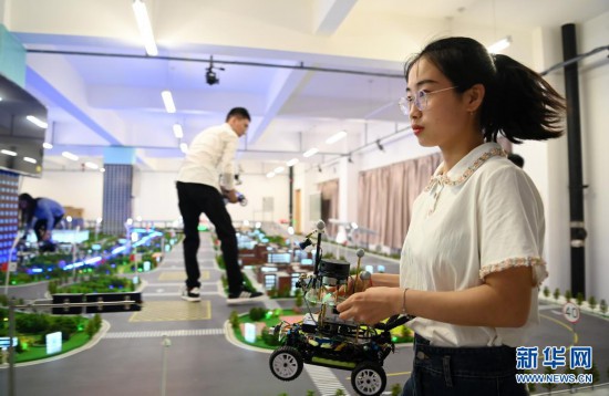 天津大學(xué)智能與計(jì)算學(xué)部的學(xué)生在沙盤教室內(nèi)調(diào)試車輛模型(6月16日攝)。