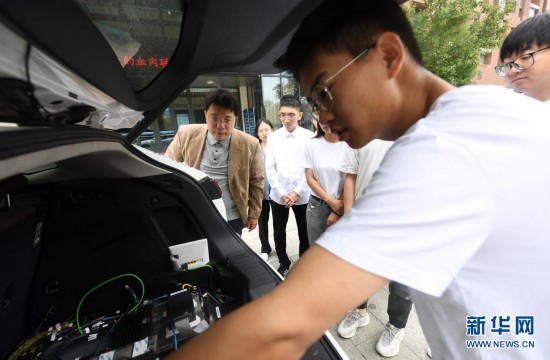 天津大學智能與計算學部教師翁仲銘(左一)在和學生一起調(diào)試自動駕駛車輛數(shù)據(jù)(6月16日攝)。