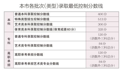 今年高招本科批次中,普通本科錄取控制分數(shù)線為400分,特殊類型招生控制分數(shù)線為513分,藝術類本科錄取控制分數(shù)線為300分,體育類本科錄取控制分數(shù)線(體育成績60分)為328分。