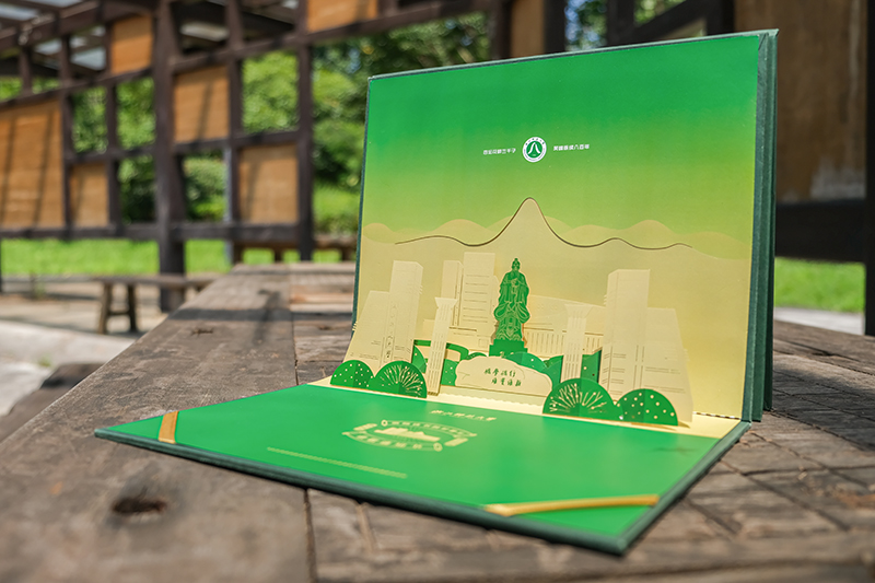 浙江師范大學的錄取通知書以綠色和金色為主色調(diào),彰顯優(yōu)雅與穩(wěn)重,內(nèi)嵌線條鏤空的立體插畫。封面正反面印著燙金的浙師元素,四角分別印有“浙”“江”“師”“范”四個字。打開通知書,浙師大標志性景觀正大門、孔子像、校訓石、圖文信息中心伴隨著不同角度的光影,層層推進、次第展開,開合之間,讓你一秒盡覽浙師美景。