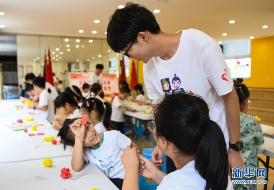 7月14日,在成都市武侯區(qū)龍騰社區(qū),志愿者指導小朋友做泥塑。
