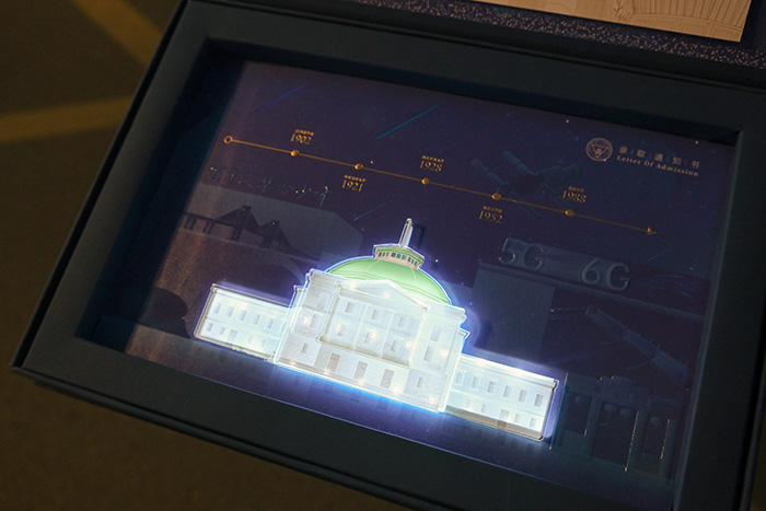 大禮堂用高透光材質(zhì)覆蓋,層次分明,細(xì)節(jié)豐富,立體感十足。打開通知書禮盒,校歌響起的同時,大禮堂也被點(diǎn)亮。