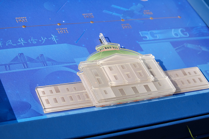 背景板上,可以看到東南大學(xué)標(biāo)志性的四牌樓南校門、以及5G到6G的變遷、中國天眼、探月計劃、三峽大壩、港珠澳大橋等學(xué)校近年來參與到的國家重器工程,均以深淺漸變的UV工藝有層次的排布在一起。每一項卓越的成就,都是東南大學(xué)的光榮和驕傲。