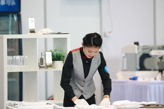餐具擺放需要間隔相等、餐巾折疊需要完全一致、4個客人4杯水齊平、操作時任何材料不可以掉出容器之外……賽前機械地重復(fù)這些的項目,并且細(xì)抓每一個打分點,過程枯燥,對于陳延的耐心是一個考驗,而更讓她為難的是用英語和客人交流。