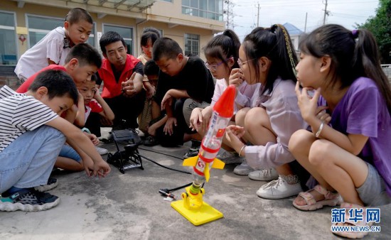 7月28日,在陜西銅川王家砭村“復(fù)興少年宮”的科創(chuàng)課上,志愿者為孩子們講解“水火箭”的原理。