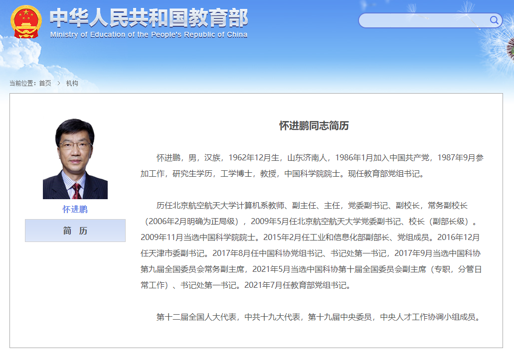 根據(jù)公開的簡歷,懷進鵬曾任北京航空航天大學黨委副書記、校長,2009年當選中國科學院院士。2015年起,先后擔任工業(yè)和信息化部副部長、天津市委副書記等職。2017年8月任中國科協(xié)黨組書記、書記處第一書記。2021年5月當選中國科協(xié)第十屆全國委員會副主席(專職,分管日常工作)、書記處第一書記。2021年7月任教育部黨組書記。