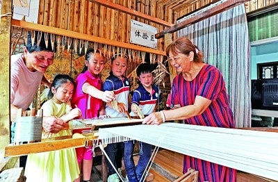 在浙江湖州南潯區(qū)輯里村湖絲博物館,小朋友體驗(yàn)手工緙絲技藝。新華社發(fā)