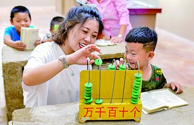 在內(nèi)蒙古赤峰市巴林左旗大良溝村鄉(xiāng)村博物館,參觀者在體驗(yàn)傳統(tǒng)計(jì)數(shù)器。新華社發(fā)