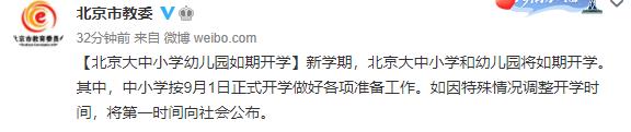 人民網北京8月16日電 今天上午,北京市教委通過官方微博發(fā)布消息稱,新學期,北京大中小學和幼兒園將如期開學。其中,中小學按9月1日正式開學做好各項準備工作。如因特殊情況調整開學時間,將第一時間向社會公布。