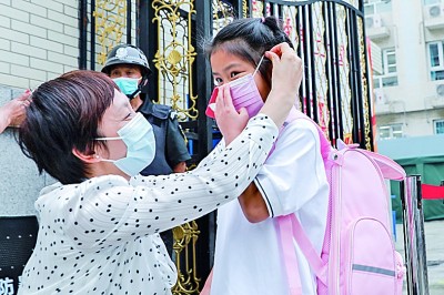 八月三十一日,北京小學(xué)廣外分校的老師在校門口為忘記戴口罩的學(xué)生佩戴、整理口罩。新華社記者 張玉薇攝