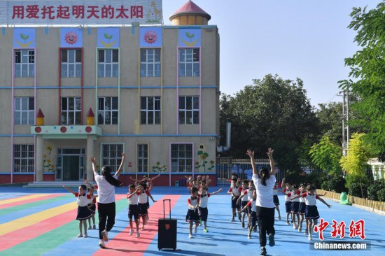 9月27日,新疆和田縣布扎克鄉(xiāng)庫木村幼兒園,小朋友在跟隨老師跳操。當(dāng)日,據(jù)該幼兒園園長(zhǎng)維吾爾族姑娘阿爾孜古麗·阿力木介紹,該園由北京市援建,可容納300名學(xué)生,目前有14名教師。 中新社記者 李雪峰/文 中新社記者 田雨昊/攝