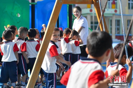 9月27日,新疆和田縣布扎克鄉(xiāng)庫木村幼兒園,小朋友在嬉戲玩耍。當日,據(jù)該幼兒園園長維吾爾族姑娘阿爾孜古麗·阿力木介紹,該園由北京市援建,可容納300名學生,目前有14名教師。 中新社記者 李雪峰/文 中新社記者 田雨昊/攝