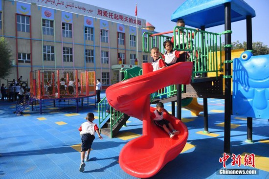 9月27日,新疆和田縣布扎克鄉(xiāng)庫木村幼兒園,小朋友在玩滑梯。當(dāng)日,據(jù)該幼兒園園長維吾爾族姑娘阿爾孜古麗·阿力木介紹,該園由北京市援建,可容納300名學(xué)生,目前有14名教師。 中新社記者 李雪峰/文 中新社記者 田雨昊/攝