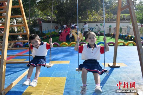 9月27日,新疆和田縣布扎克鄉(xiāng)庫木村幼兒園,小朋友在蕩秋千。當(dāng)日,據(jù)該幼兒園園長維吾爾族姑娘阿爾孜古麗·阿力木介紹,該園由北京市援建,可容納300名學(xué)生,目前有14名教師。 中新社記者 李雪峰/文 中新社記者 田雨昊/攝