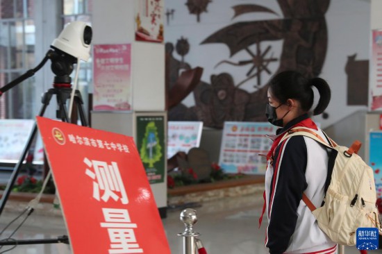 10月8日,學(xué)生經(jīng)過測溫后進(jìn)入哈爾濱市第七中學(xué)教學(xué)樓。