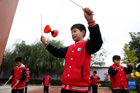 10月8日,河北省邢臺市任澤區(qū)達(dá)二小學(xué)學(xué)生在練習(xí)抖空竹。新華社記者 駱學(xué)峰 攝