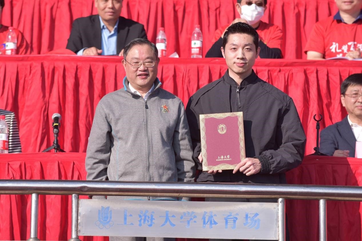 上海大學(xué)黨委書記成旦紅為許昕頒發(fā)聘書。上海大學(xué)供圖