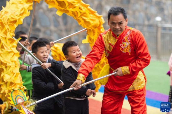 11月17日,在堯天坪鎮(zhèn)幼兒園,龍獅藝人文麥秋(右一)帶領(lǐng)學(xué)生練習(xí)舞龍。新華社記者 陳思汗 攝