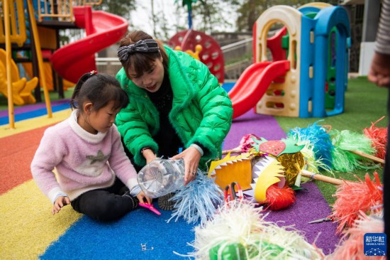 11月17日,在堯天坪鎮(zhèn)幼兒園,老師指導(dǎo)學(xué)生手工制作舞龍道具。新華社記者 陳思汗 攝